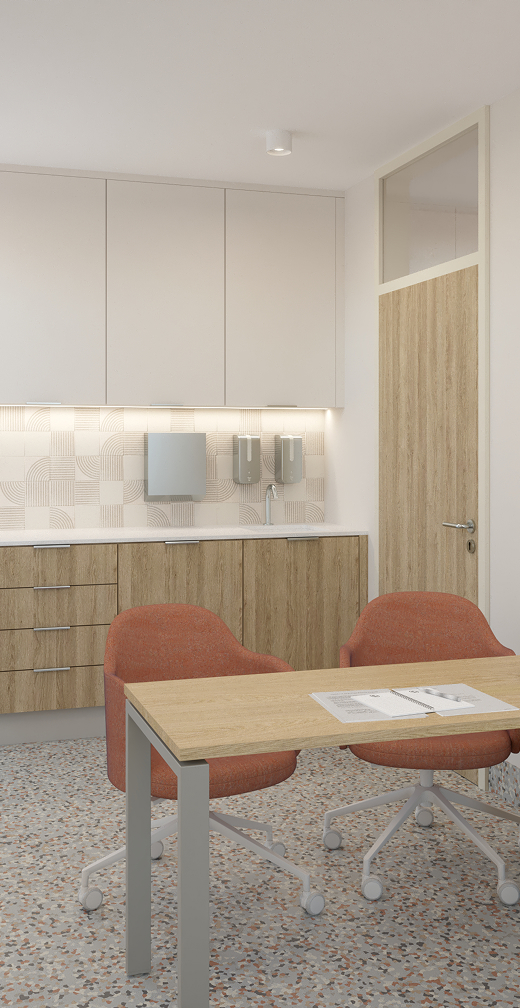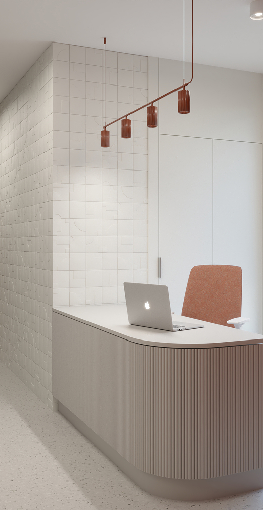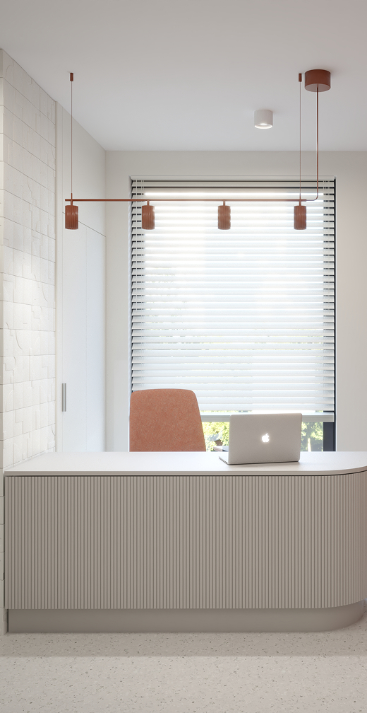 Wydzielone strefy: recepcja, poczekalnia, zaplecze socjalne