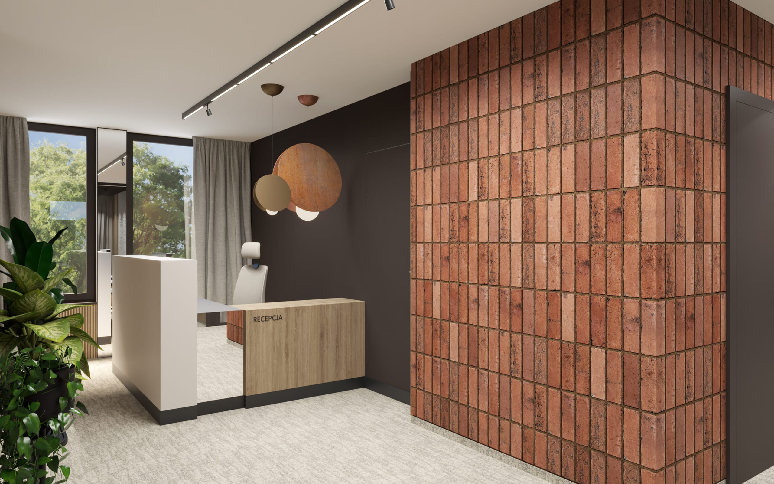 Wydzielone strefy: recepcja, poczekalnia, zaplecze socjalne